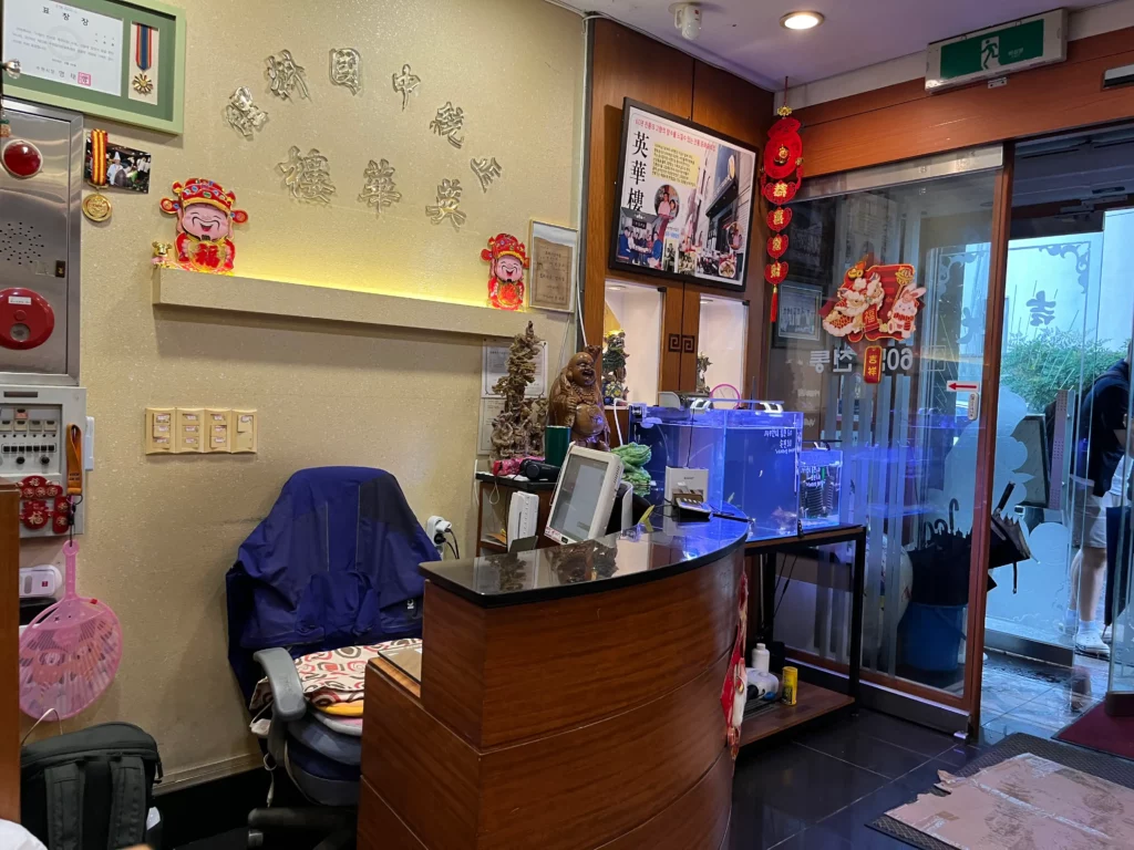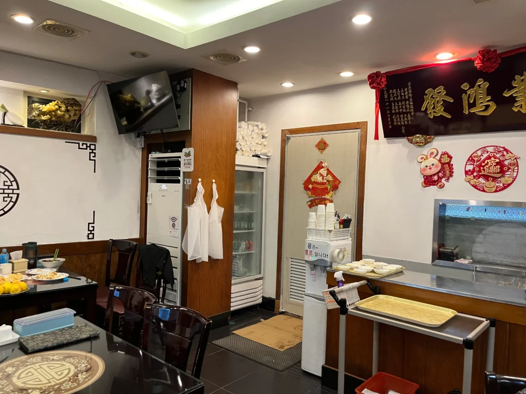 식당 내부로 들어서면 고풍스러운 분위기가 느껴집니다. 중국 전통 장식품과 그림들이 벽면을 장식하고 있어 마치 중국 본토의 식당에 온 것 같네요.
