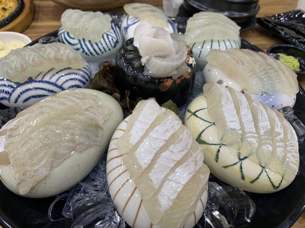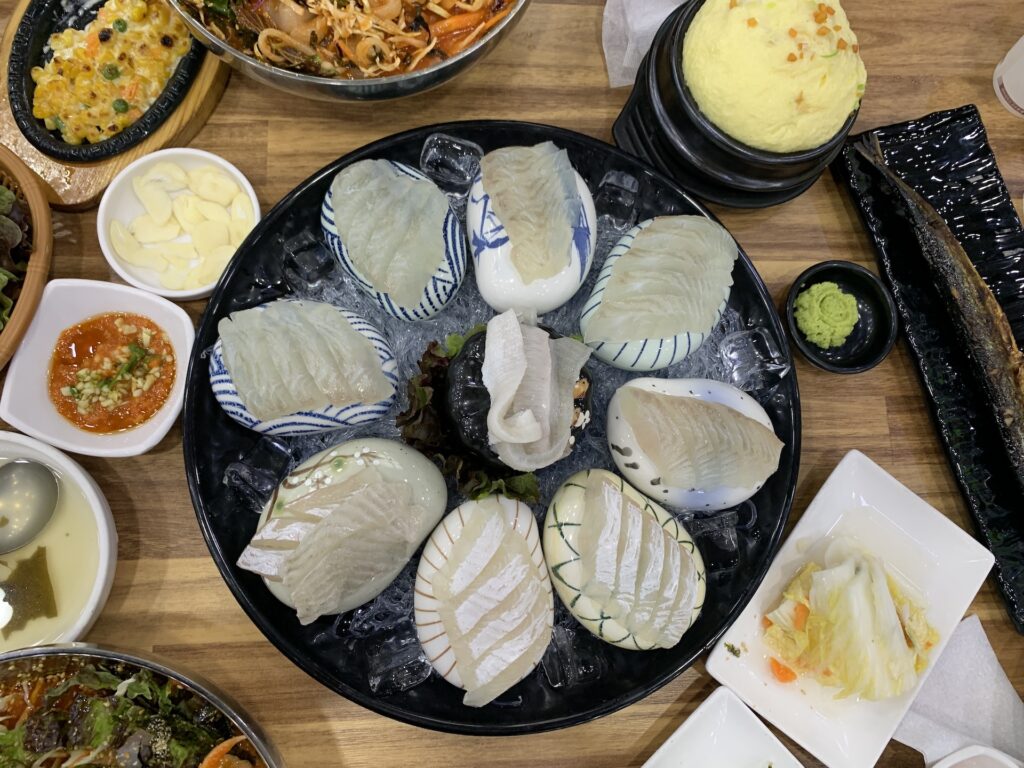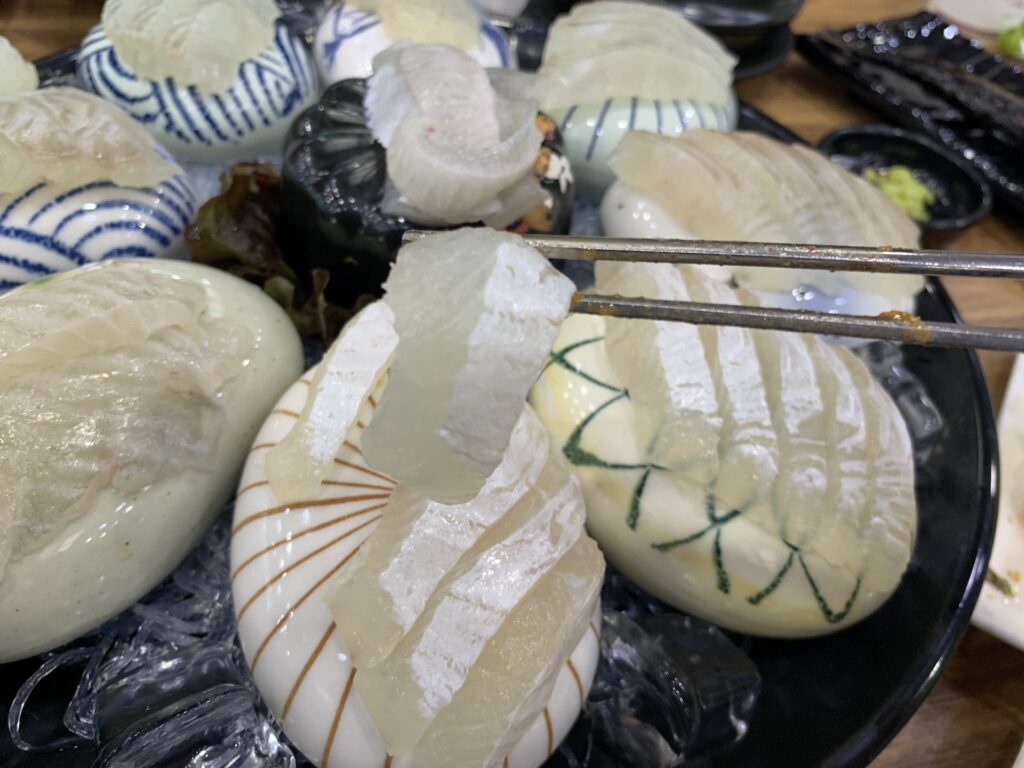 회의 신선도를 유지하기 위해 시원한 돌위에 회가 올려져있는데